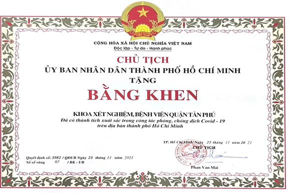 - Năm 2021, đã có thành tích xuất sắc trong công tác phòng, chống dịch Covid – 19 trên địa bàn thành phố Hồ Chí Minh (Quyết định số 3982/QĐ-UBND ngày 23/11/2021 của Ủy ban nhân dân Thành phố Hồ Chí Minh)
