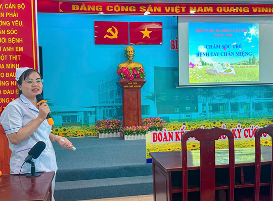 Nhằm tiếp tục nâng cao năng lực chuyên môn và cập nhật những kiến thức mới nhất trong việc điều trị và chăm sóc trẻ bệnh Tay chân miệng. Ngày 07/04/2026, Phòng Điều dưỡng đã phối hợp với Khoa Nhi Bệnh viện Đa khoa Tân Phú tổ chức thành công buổi Sinh hoạt Khoa học Kỹ thuật với chuyên đề "Chăm sóc trẻ bị bệnh tay chân miệng".