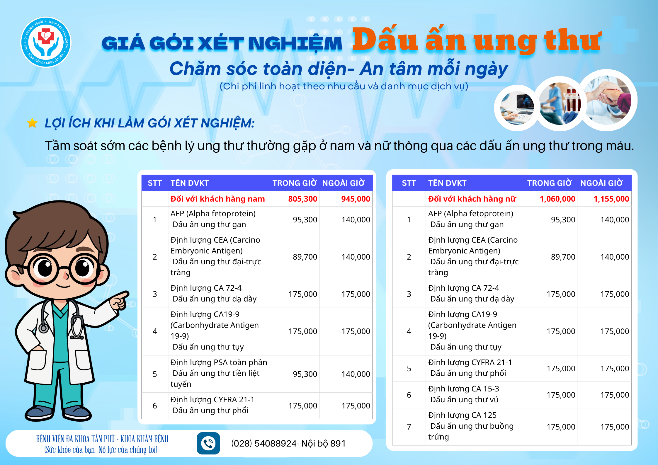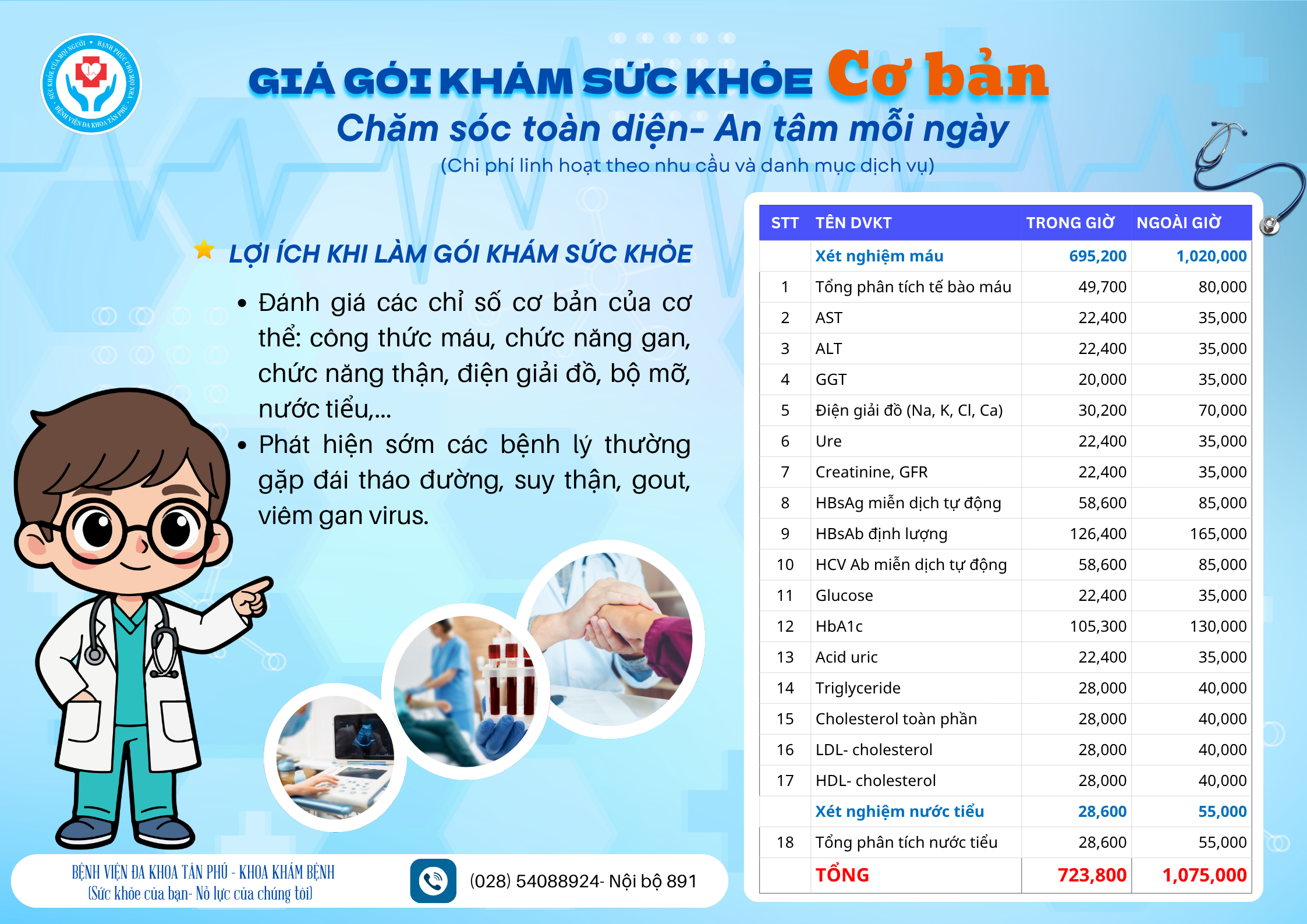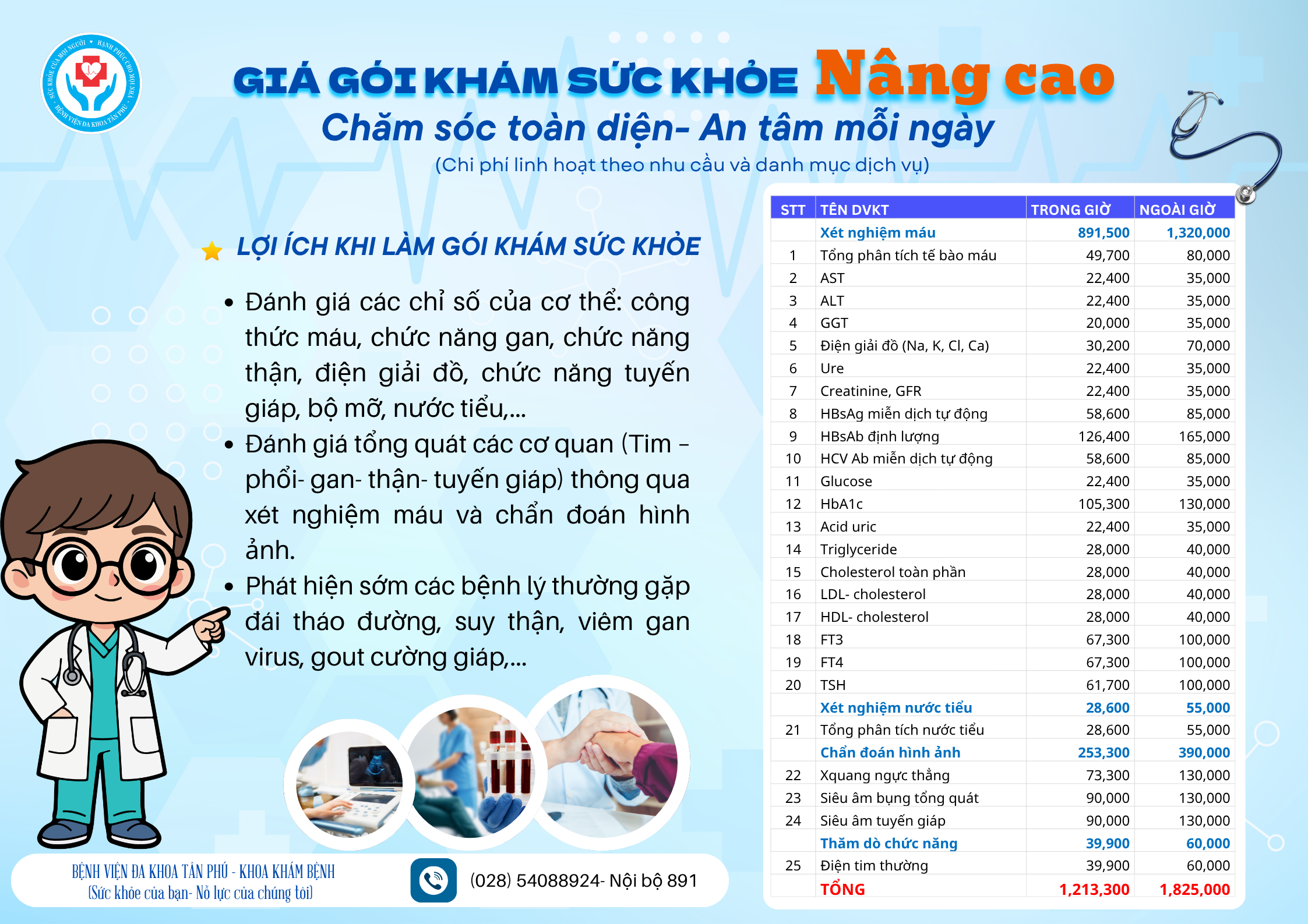 Bệnh viện Đa khoa Tân Phú xin giới thiệu các quý khách hàng có nhu cầu về các gói khám sức khỏe, có thể liên hệ trực tiếp Khoa Khám bệnh (028) 54088924- nội bộ 891