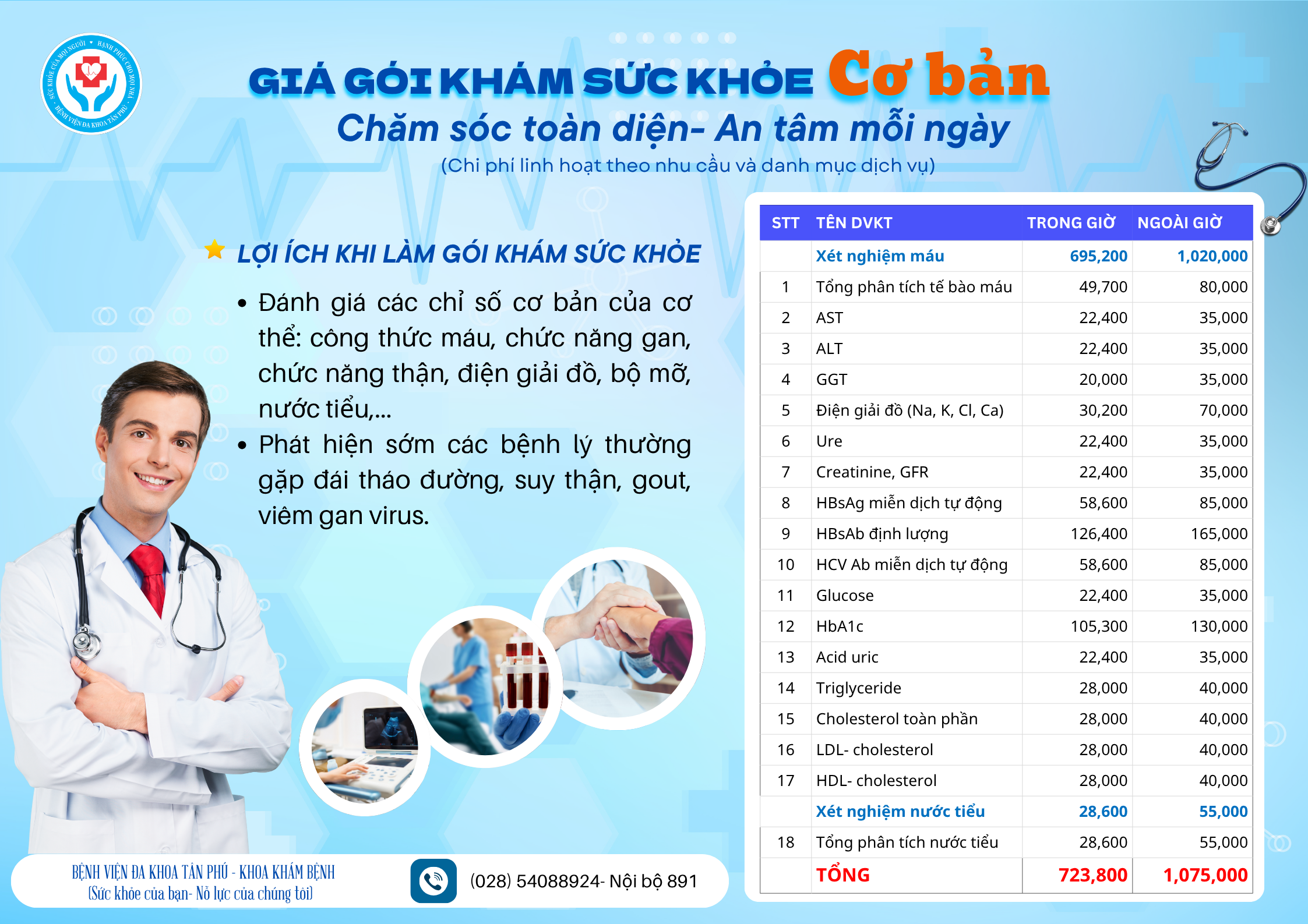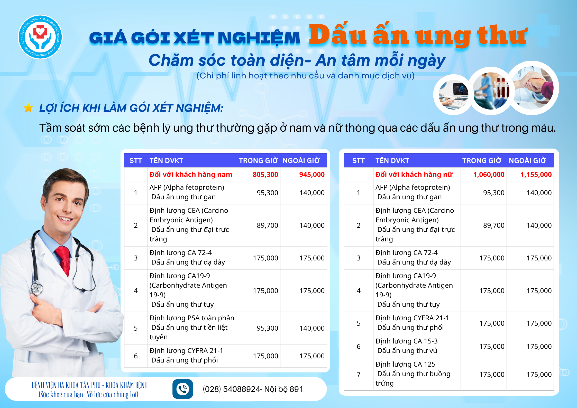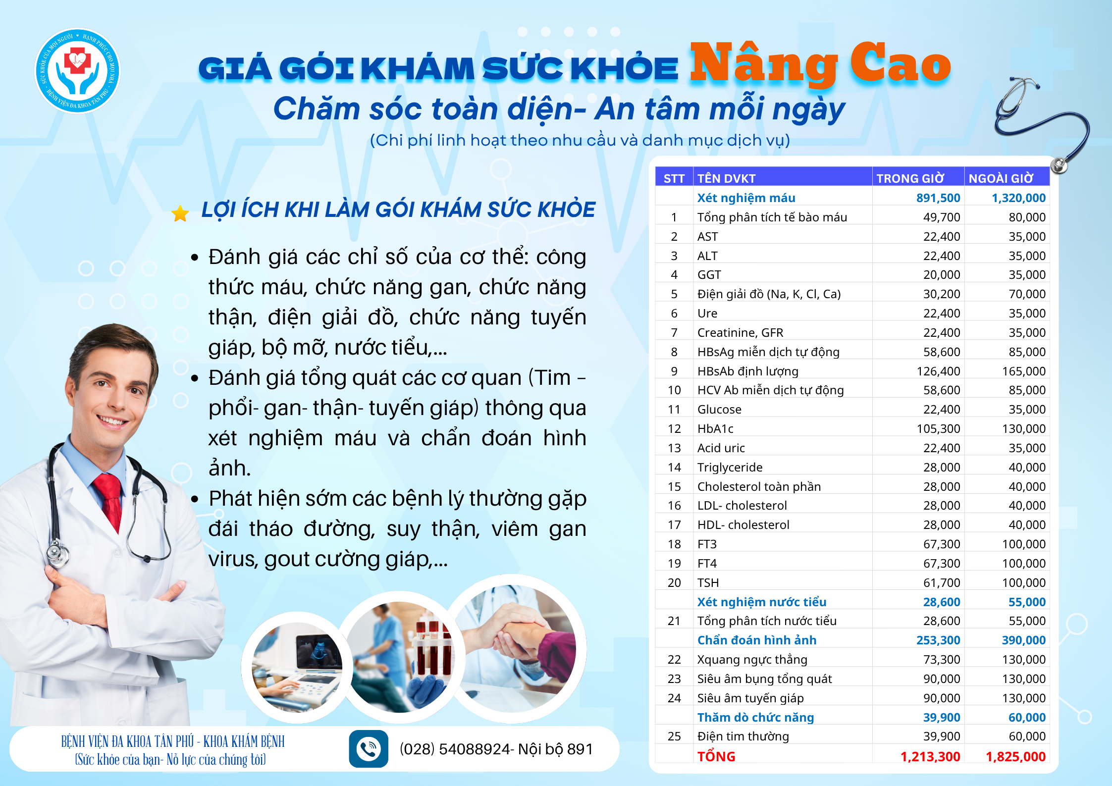 Bệnh viện Đa khoa Tân Phú xin giới thiệu các quý khách hàng có nhu cầu về các gói khám sức khỏe, có thể liên hệ trực tiếp Khoa Khám bệnh (028) 54088924- nội bộ 891