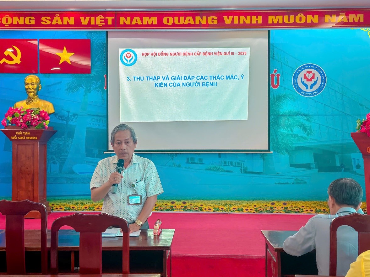 Phát biểu tại buổi họp, BS.CKII Lương Văn Sinh – Phó Giám đốc Bệnh viện đã gửi lời cảm ơn đến tất cả người bệnh, thân nhân đã tích cực tham gia, đóng góp ý kiến để bệnh viện ngày càng hoàn thiện. Ông nhấn mạnh, những phản hồi quý báu từ người bệnh chính là động lực để tập thể cán bộ, nhân viên y tế không ngừng nỗ lực nâng cao chất lượng dịch vụ, hướng đến hướng đến sự hài lòng, an toàn và niềm tin của người bệnh.